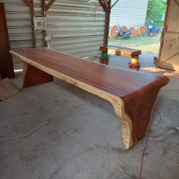Pembuatan meja ini melibatkan teknik pengerjaan kayu yang cermat, dimulai dari pemilihan bahan, pemotongan, perakitan, hingga penyelesaian akhir seperti pengamplasan dan pelapisan. Pada tahap pemotongan di lakukan di rumah pemotongan kayu dengan kapasitas penggergajian yang cukup besar, tentunya untuk mengimbangi log kayu yang cukup besar, kemudian dilanjutkan dengan penggergajian manual menggunakan mesin chainsaw pada saat memotong log kayu untuk bagian kaki meja. Kaki meja ini tersambung langsung dengan top meja, sehingga terkesan seperti huruf L . Proses selanjutnya penghalusan pada seluruh permukaan kayu yang dilakukan oleh tukang yang sudah sangat berpengalaman. Untuk tahap finishing dengan tehnik pewarnaan menggunakan spray maupun kuas sesuai dengan permintaan dari para customer.