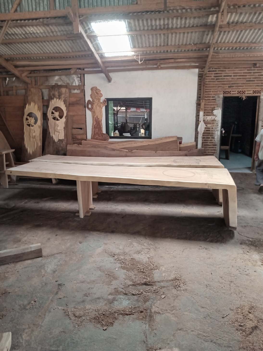 Desain meja ini menonjolkan bentuk alami dari kayu yang digunakan, terlihat dari bentuk ujung-ujung meja yang tidak simetris dan mengikuti kontur asli dari potongan kayu. Pendekatan ini dikenal sebagai live edge atau natural edge, di mana tepi kayu dibiarkan alami untuk menambah karakter dan keindahan meja tersebut.