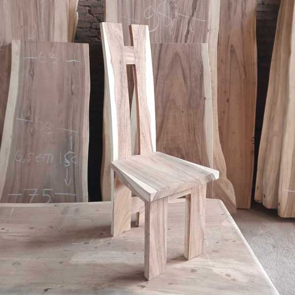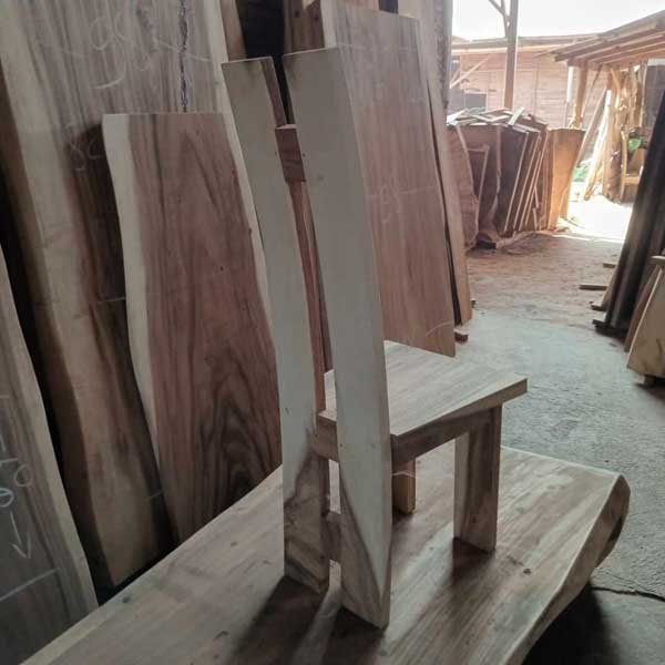 • Material Utama: Kursi ini terbuat dari kayu trembesi solid, yang dikenal karena kekuatan, keawetan, dan pola serat kayu yang menarik. Warna kayu trembesi yang kaya dan tekstur uniknya menambah nilai estetika pada kursi.